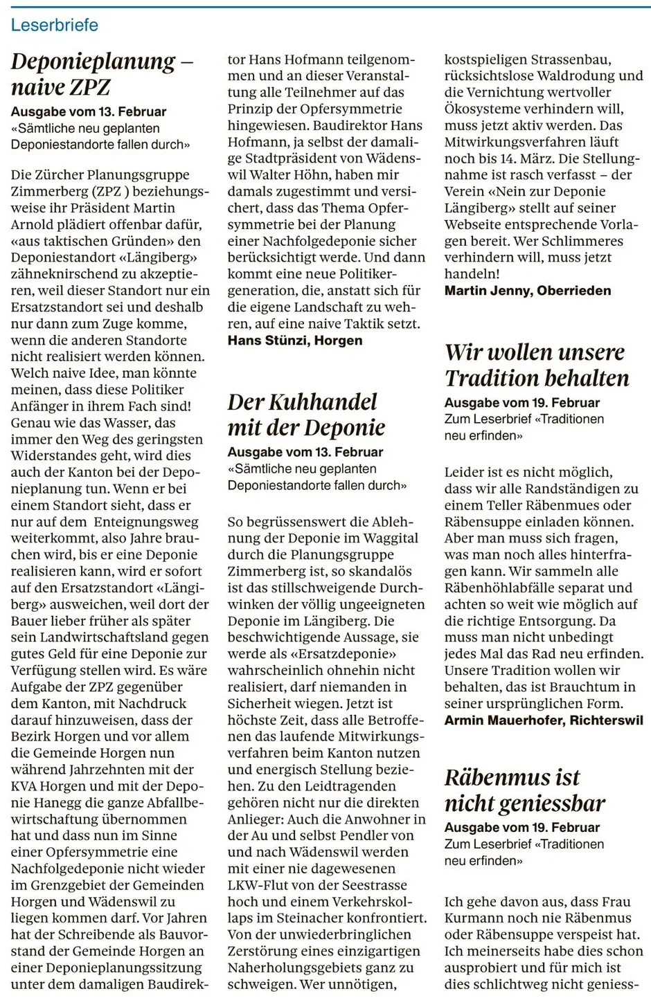Zusammenfassung: Mehrere Leserbriefe zum ZSZ Artikel vom 13.2.2025 welche die Haltung der ZPZ kritisieren